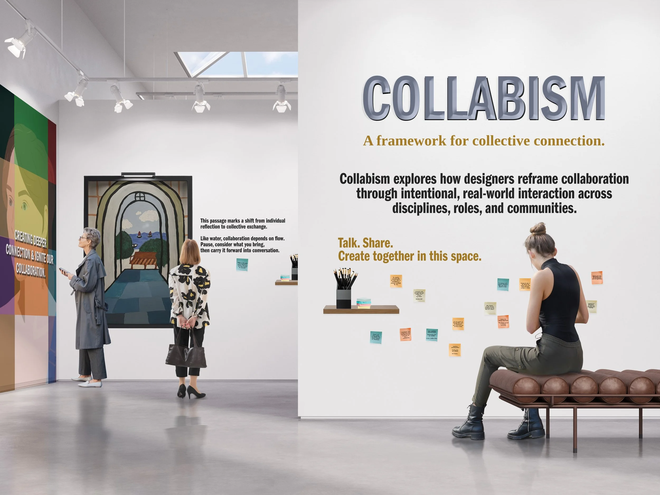 Collaborative Design Language: Develops a visual system centered on dialogue, layered typography, shared authorship, and spatial pacing, reinforcing the idea that creation is collective rather than individual.